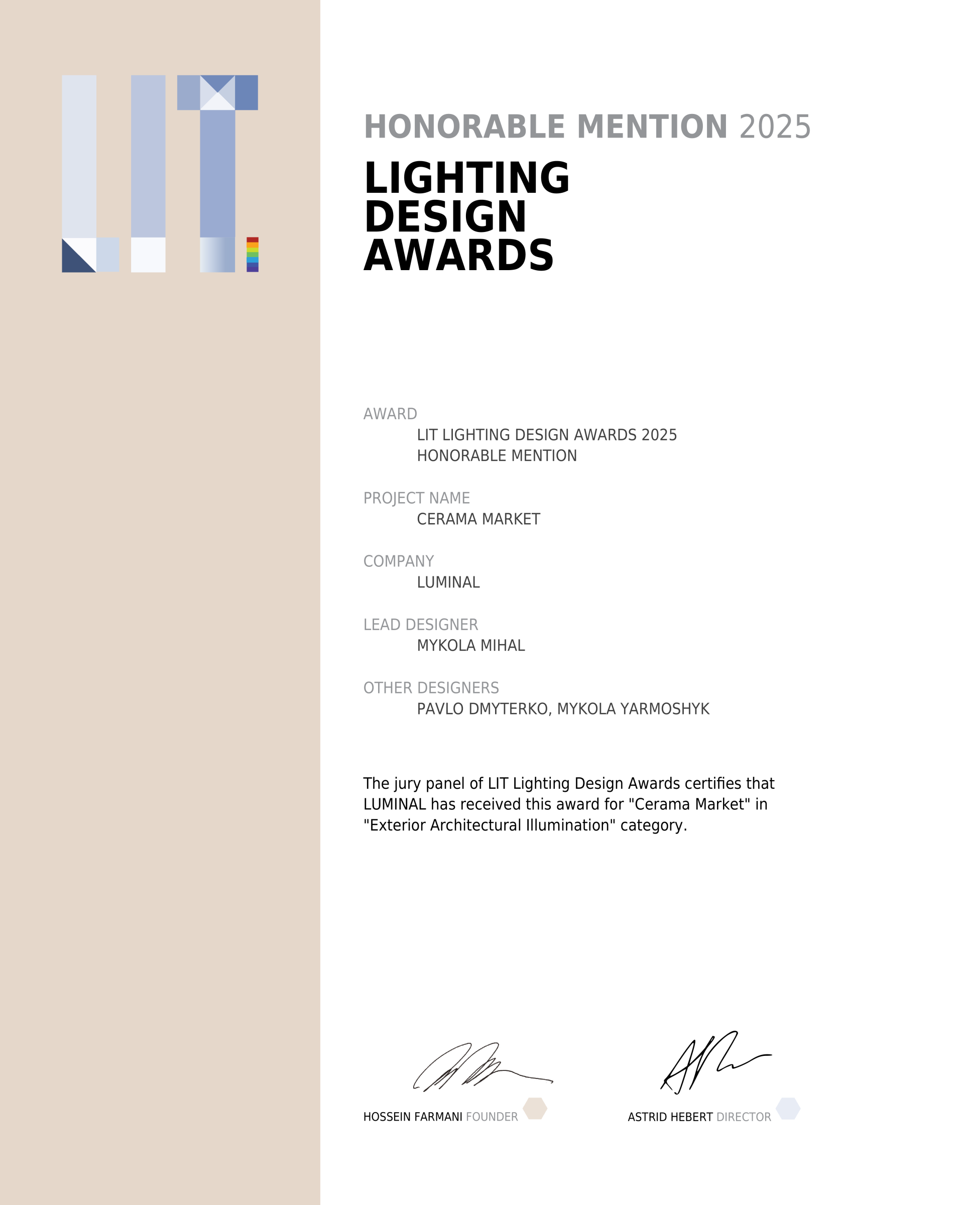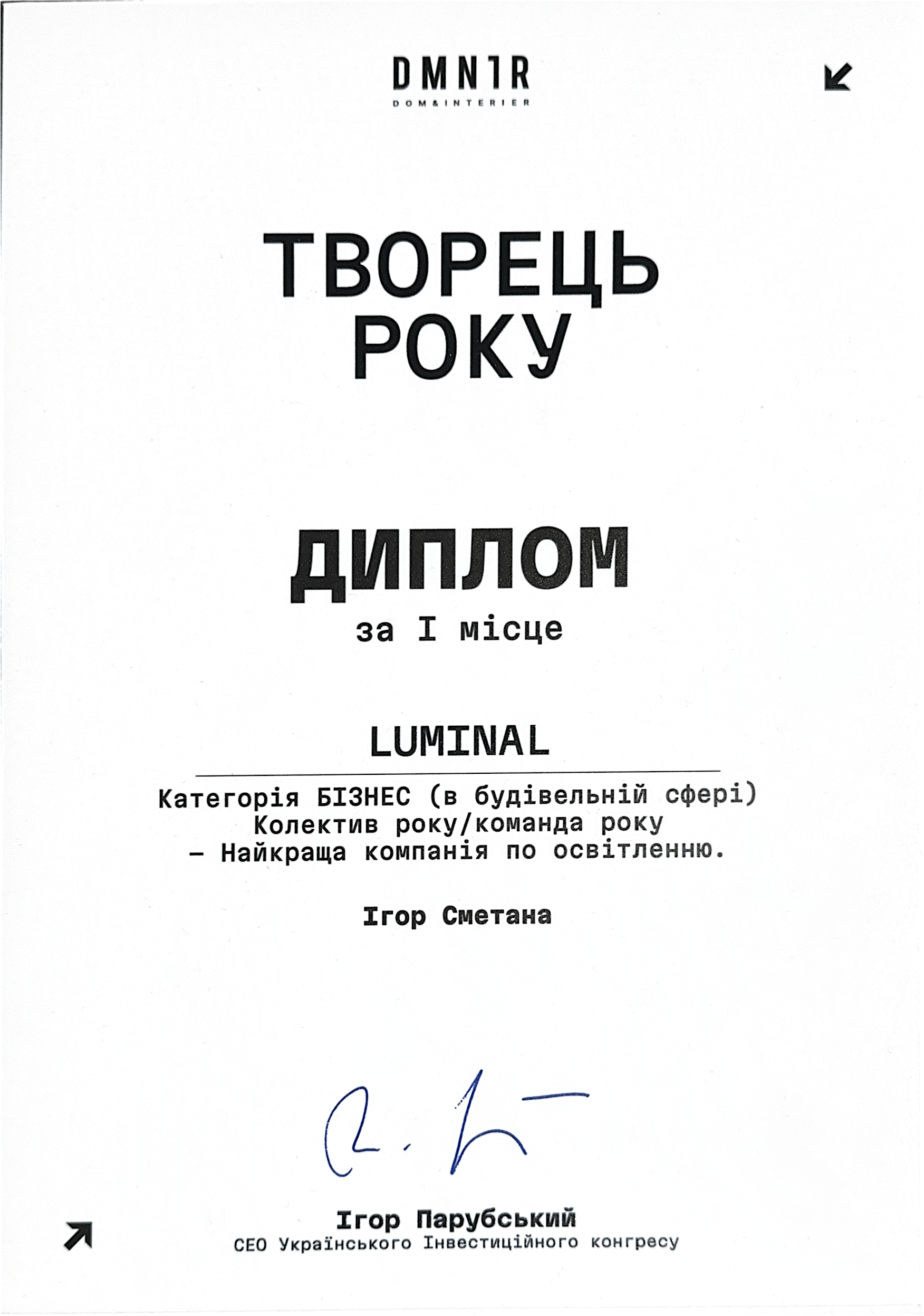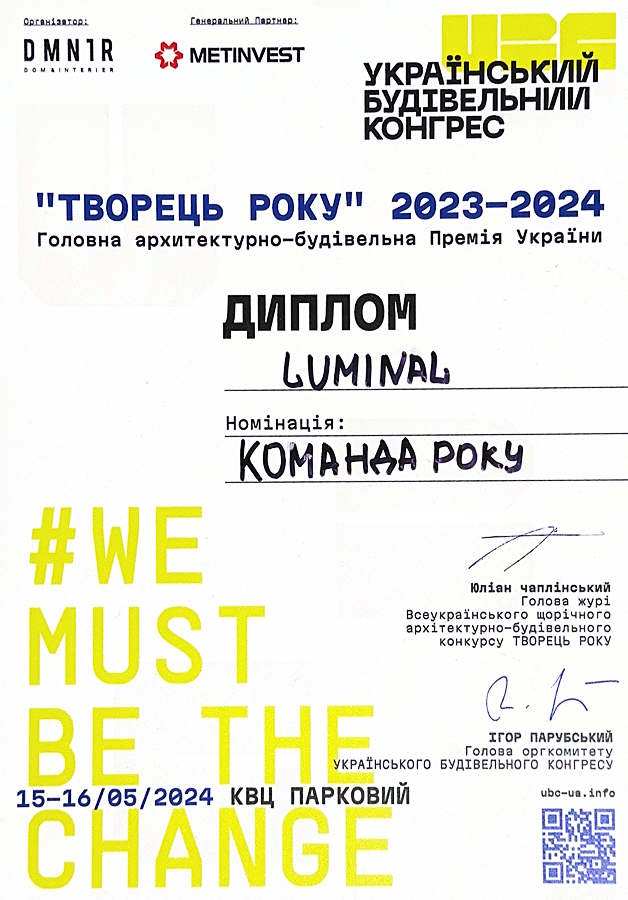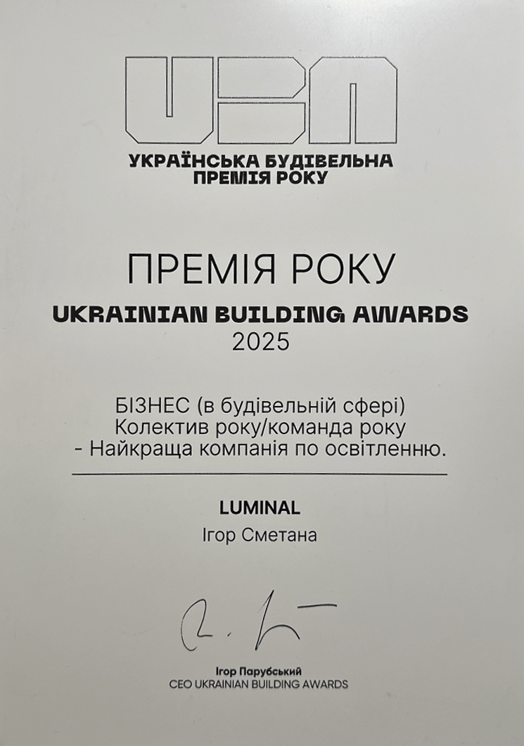LUMINAL — компанія світлодизайну з двадцятирічним досвідом експертизи, в компетенціях якої — розроблення концепцій та індивідуальних освітлювальних рішень, покрокова реалізація проєктів різної типології — архітектурного, зовнішнього, інтерʼєрного та промислового освітлення; виготовлення та кастомізація освітлювальних приладів.